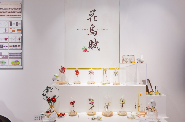 作品《花鸟赋》将设计与传统手工技艺——缠花相结合,展现中国的花卉文化,传达“人与自然和谐共生”的理念。