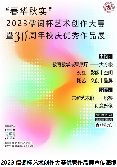 本次儒词展的主题是“春华秋实”,华厦30周年校庆的日子,正是春去秋来收获的季节,让师生们、员工们在展览里触摸秋叶的脉络,拾取属于特有的秋之回忆。展览在大方楼教学成果展示厅(主馆)和常勋艺术馆(副馆)两大展馆共同展出,让师生们、员工们在观展的过程中一同见证华厦人文的教育成果。