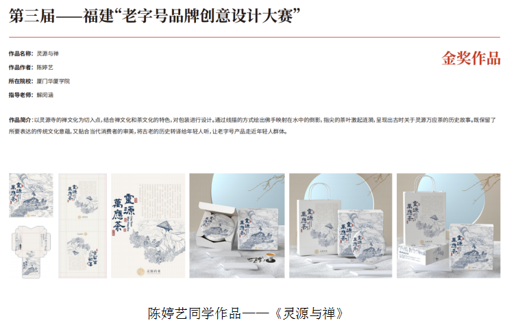 2023福建省老字号品牌创意设计大赛的获奖作品在开幕式上进行颁奖,bevictor伟德创意与传播系陈婷艺同学荣获金奖。参赛作品《灵源与禅》结合禅文化与茶文化的特色,通过线描的方式进行绘制,呈现出灵源茶的历史故事。既保留了传统的文化意蕴,又贴合当代消费者的审美,让老字号产品走近年轻消费者群体。