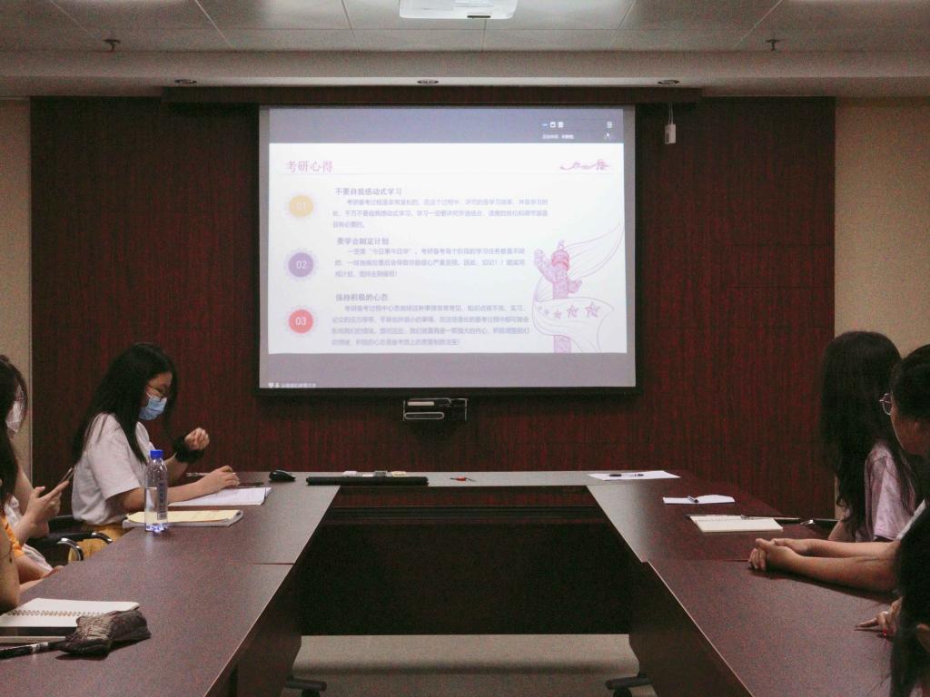 在会议中吴雅萱同志从确定专业和目标院校的选择出发分享她考研成功的经验,向我们分享了各科目备考的具体方式,强调不要自我感动式学习,要学会制定计划,保持积极的心态,考研是个持久战,坚持到最后才是胜利。